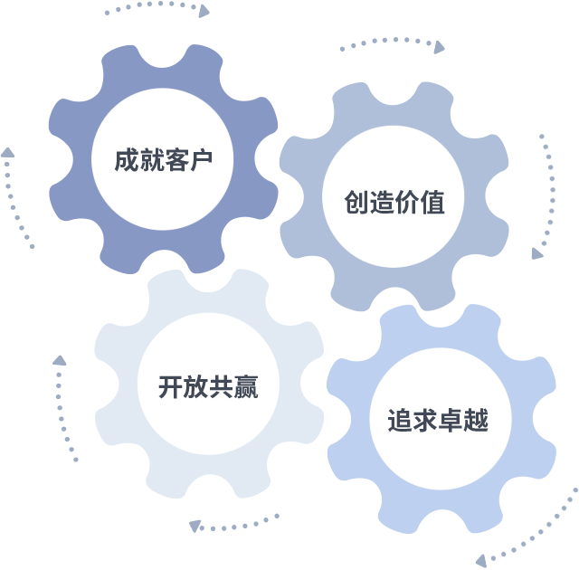 成就客户是一切决策的出发点,创造价值是衡量所有工作的标准,追求卓越是云顶国际做事做人的态度,开放共赢是云顶国际的格局也是最终的结果。价值观的齿轮环环相扣,推动着组织里的每个人不断向前。